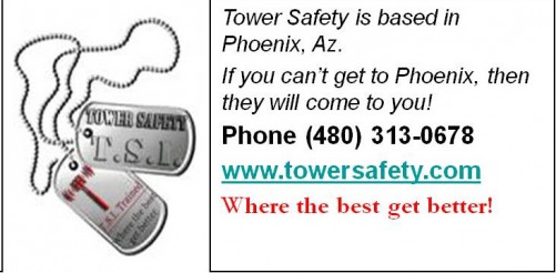 Tower Safety and Instruction, how often do you hear that as a sales pitch? Well, you know you need it to work in this industry. With the NWSA certification coming out, you know that your climbers need to be trained. My sponsor, Tower Safety, (480-313-0678) is more than just someone who helps me out! They are an Arizona accredited school, which is more than most schools can say. They are approved by the state as a real school in Arizona. Yes, not a fly by Night Company but a certified school that is also currently a member of NATE.